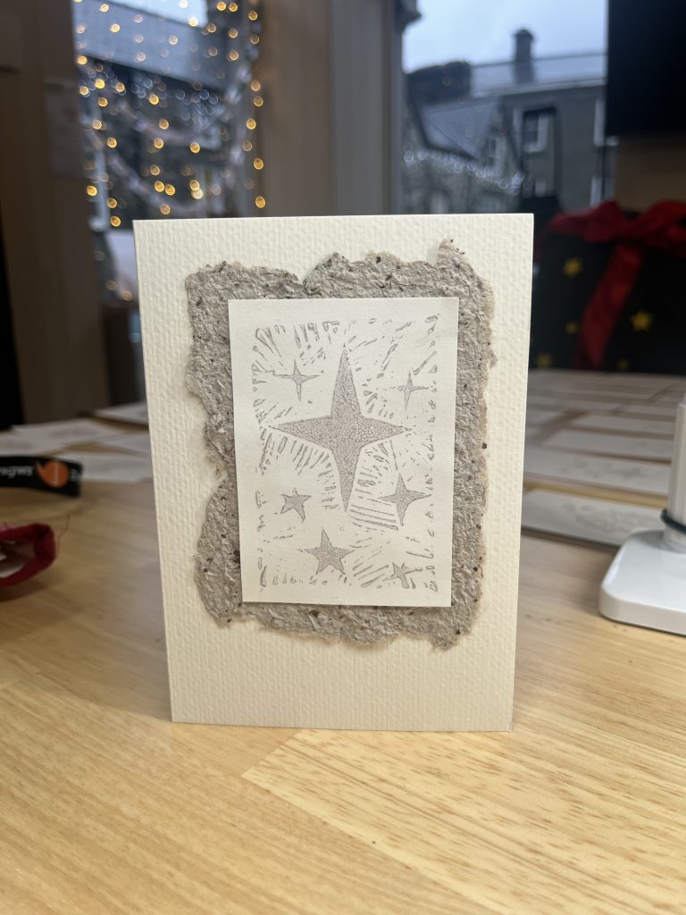 November brought some very wet and wild weather but also a hint of Festive fun and we made test batched of ink using walnut husks and oak galls. We mixed the ink with an acrylic medium to make it suitable for printing and began testing the best way to use it to print seasonal cards. Production of the cards continued alongside workshops making Book Cushions, and repeat of the popular workshop making Adult Dungarees. We were glad to help people make Christmas gifts for friends and family in November.